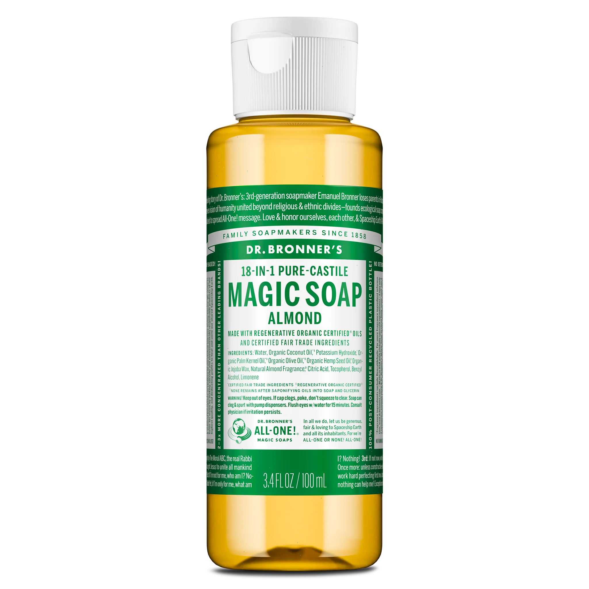 Warm, nutty, and slightly sweet—Dr. Bronner’s Almond Liquid Soap delivers a rich, comforting experience! Made with Regenerative Organic Certified® oils, this true soap creates a rich, smooth lather that leaves you feeling renewed and rinses clean. Made with organic, ethically sourced ingredients and no detergents, dyes, or added foaming agents, it’s a great soap for everyday use. Vegan, made with organic oils, fair trade, and EWG Verified®—a clean that cares for you and the planet!