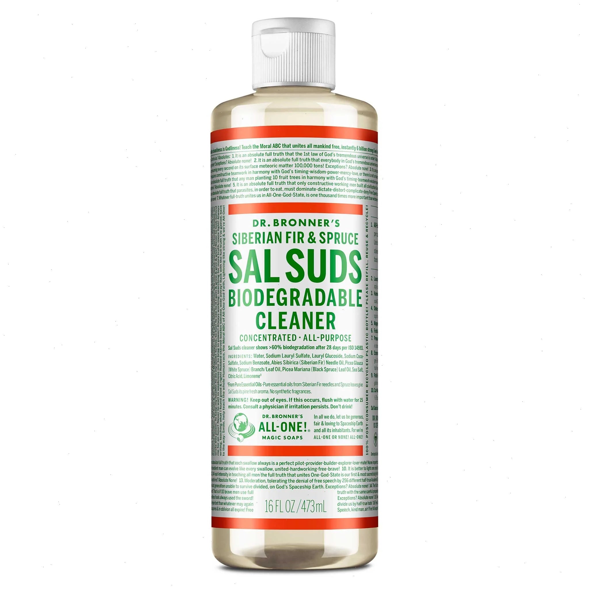 Dr. Bronner's Sal Suds Liquid Cleaner is not a soap but instead is a concentrated hard-surface all-purpose cleaner. It is made with plant-based surfactants and natural fir needle and spruce essential oils (no cheap, harsh pine stump oil), without any synthetic dyes or fragrances. Perfect for general household cleaning (dishes, floors, laundry, etc.), it cleans and rinses with exceptional power, yet it is mild and gentle on the skin. Sal Suds Liquid Cleaner is equally effective in hard or soft water, rinsing freely, hot or cold. Sal Suds is EWG Verified® for peace of mind—because caring for your home should also care for the planet!